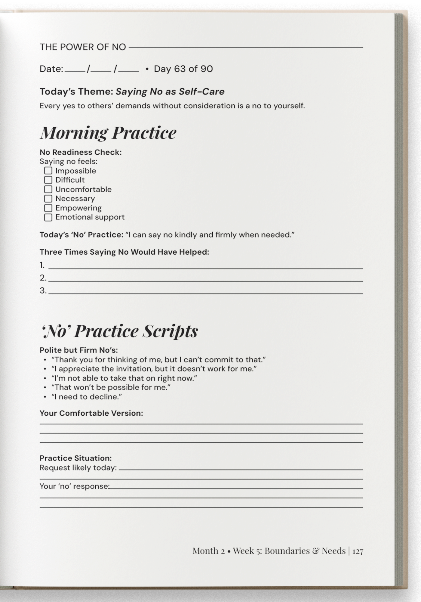 ✓ Boundary Setting Protocols: Studies demonstrate that clear boundary scripts increase follow-through by 70% compared to intention alone.
