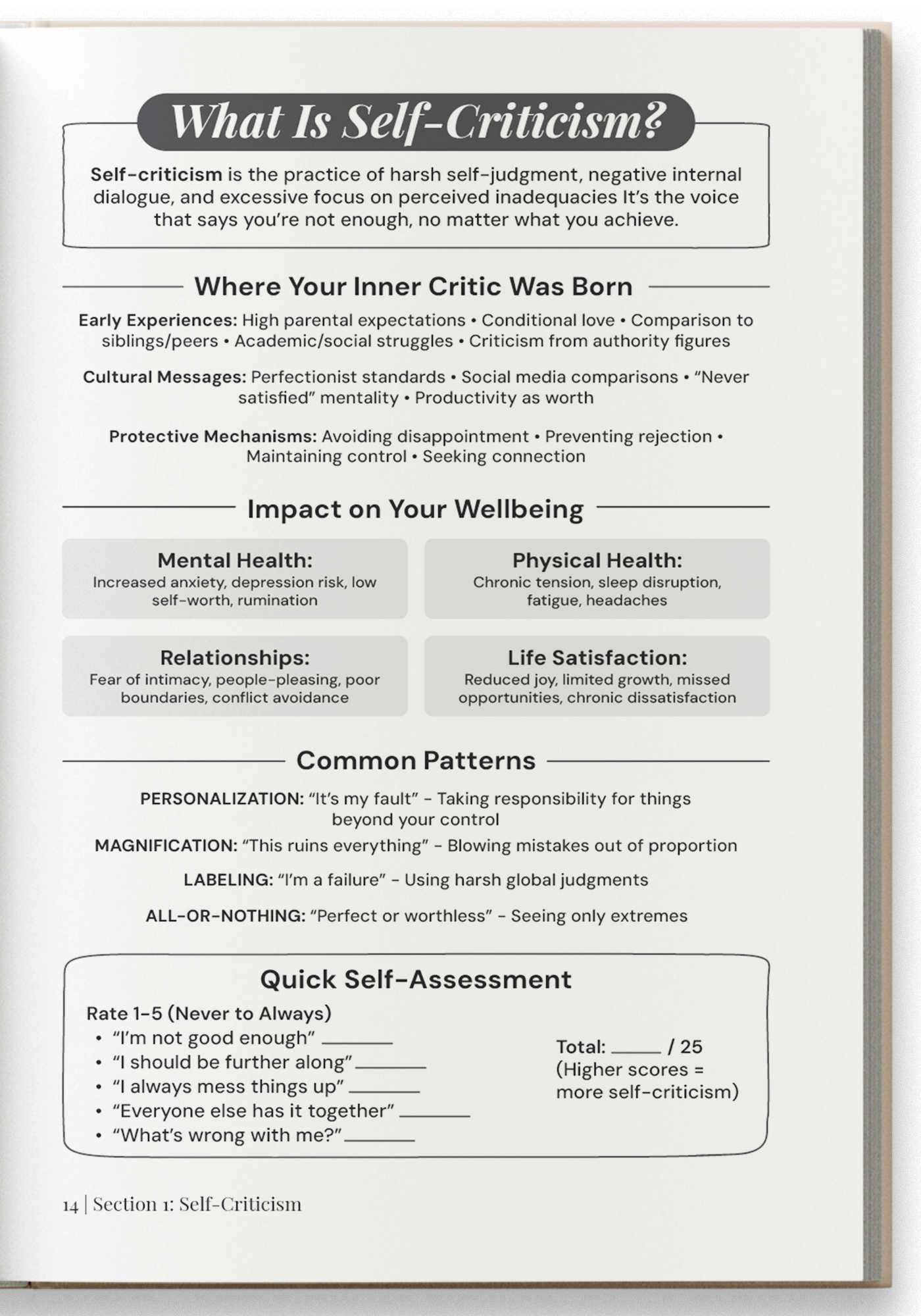 ✓ Cognitive Reframing (CBT): The 4-step "Catch-Challenge-Change-Practice" method proven to reduce self-criticism by 40% in clinical studies.