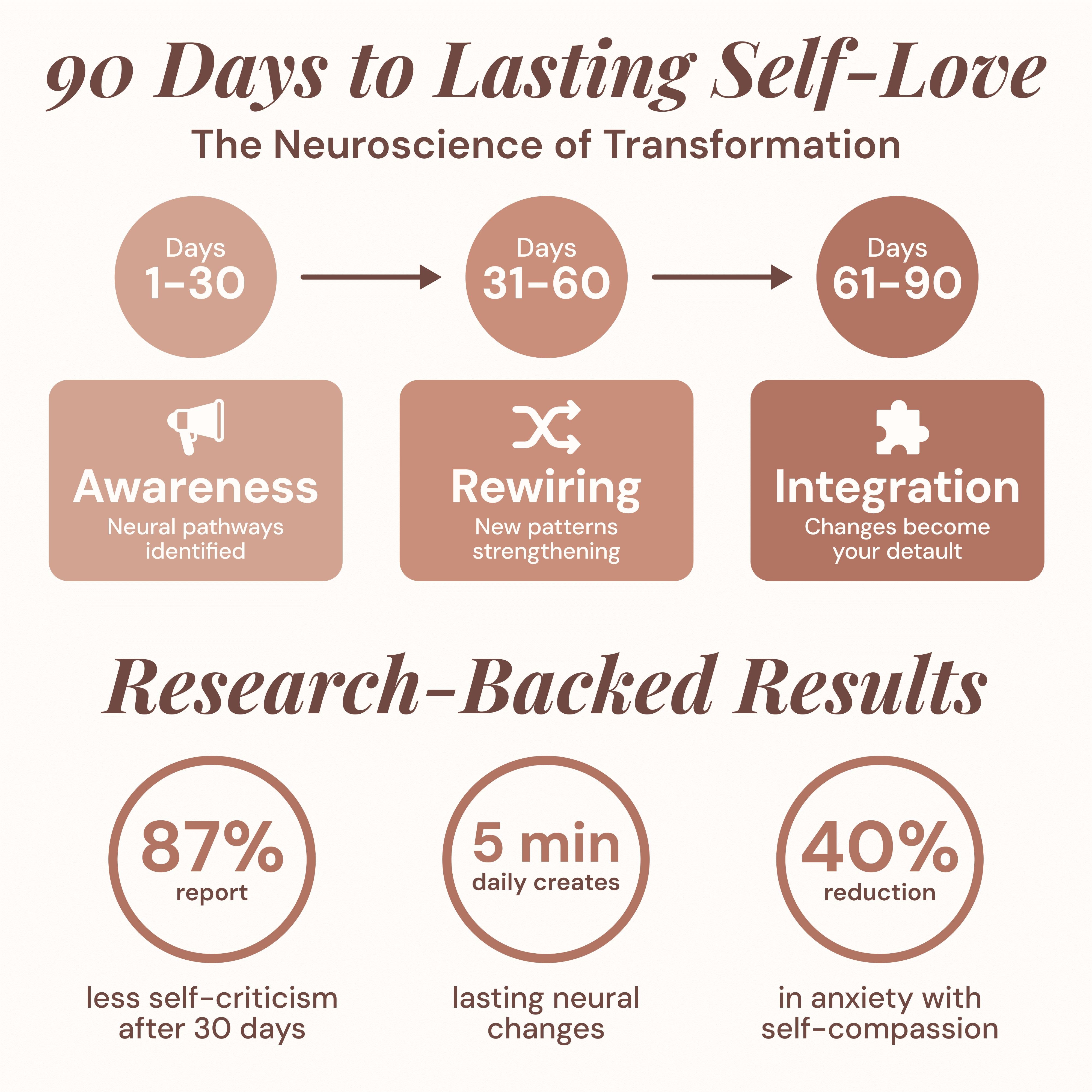 ✓ The 5 transformation modules: Self-Criticism → Self-Neglect → Self-Acceptance → Self-Compassion → Self-Love. Built on psychology, not wishful thinking.