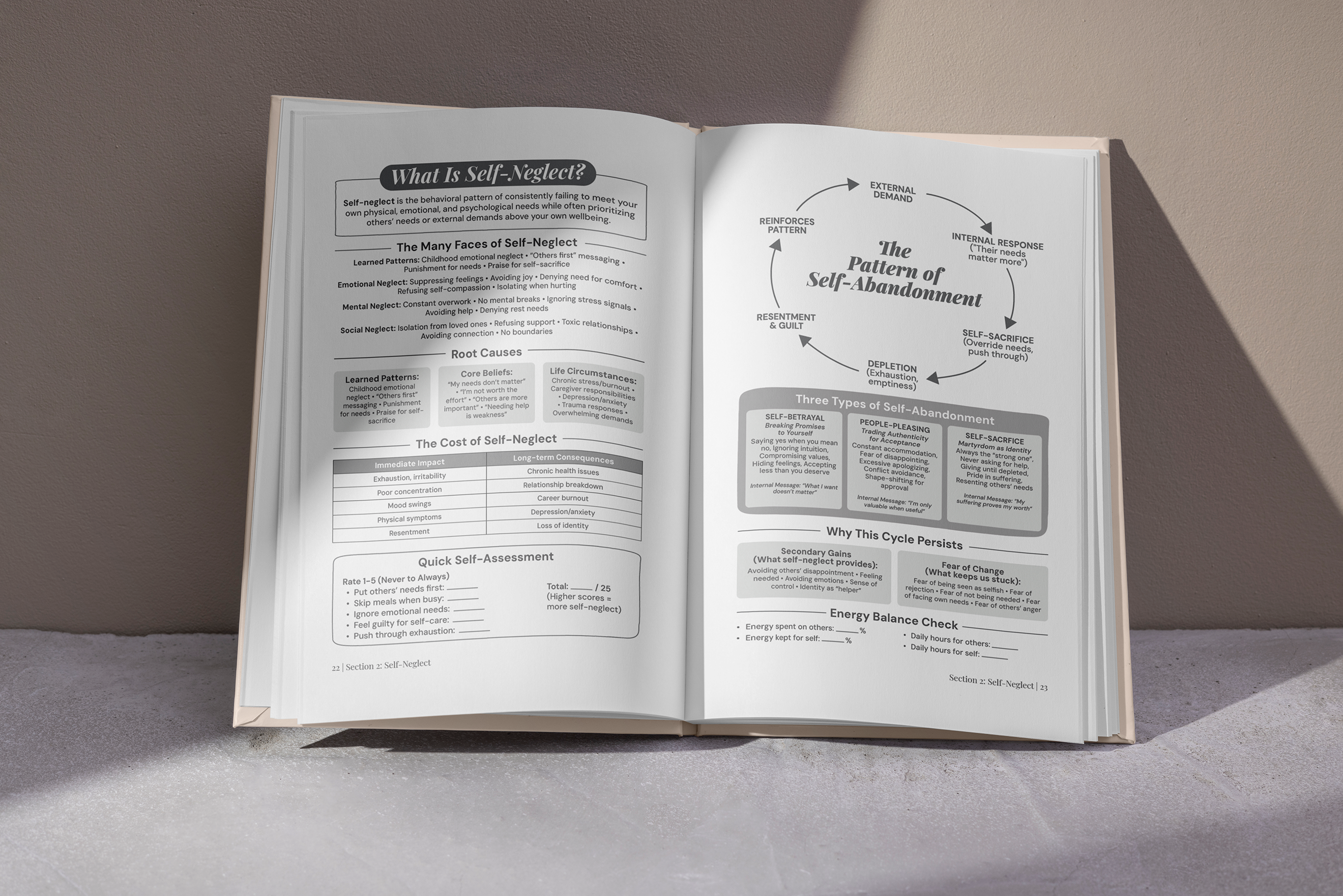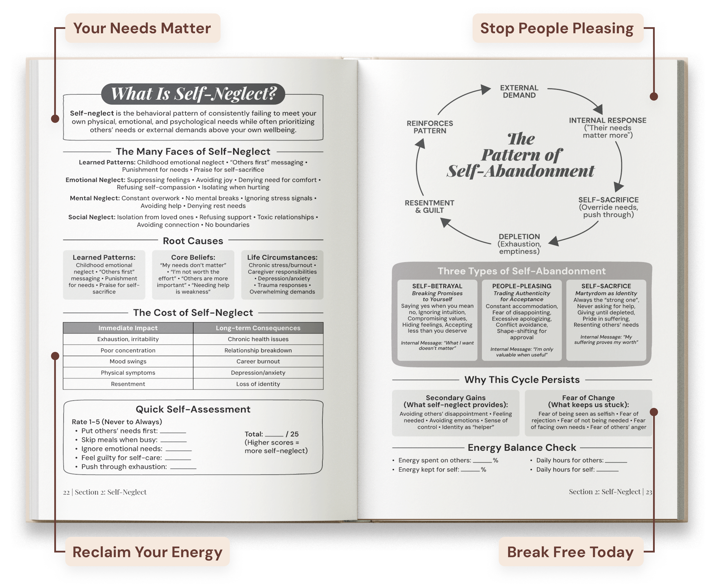✓ The people-pleasing prison you can't escape — Word-for-word scripts to set boundaries without the crushing guilt. Plus weekly exercises to unlearn the "I only matter when I'm useful" lie.