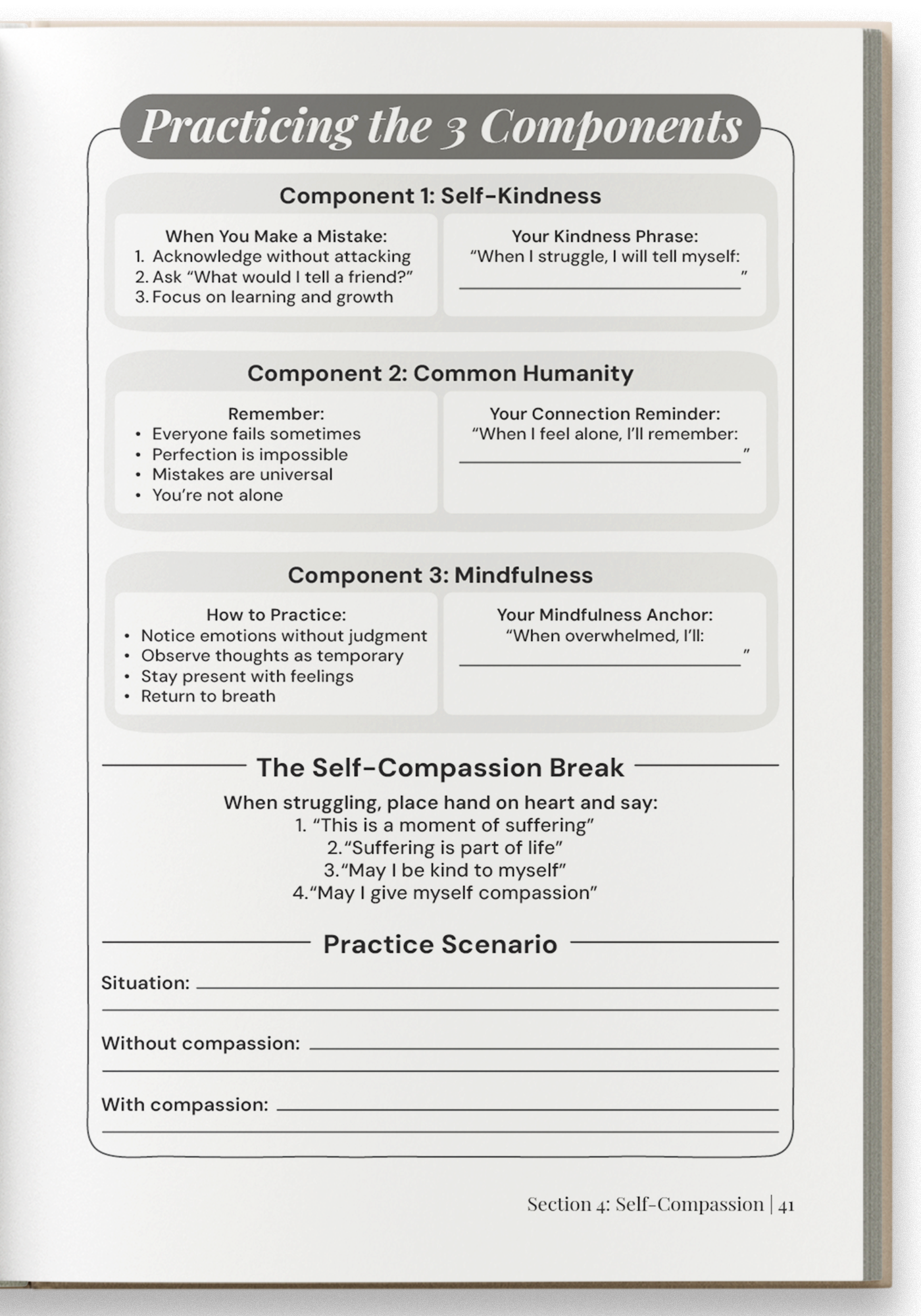 ✓ Self-Compassion Framework: Based on Dr. Kristin Neff's pioneering research showing self-compassion reduces anxiety by 23% and depression by 26% more effectively than self-esteem training.