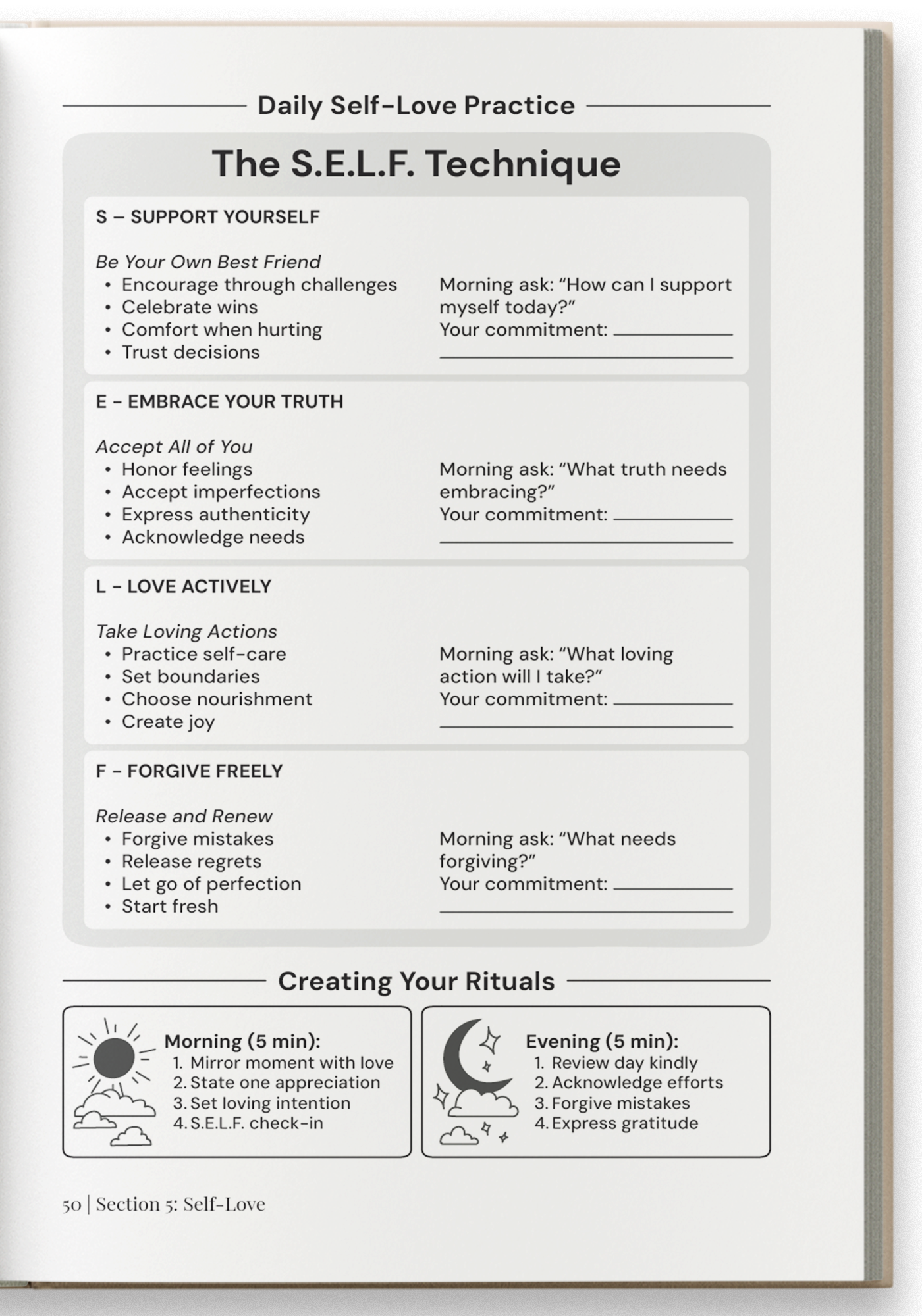 Your daily blueprint for self-love: Support, Embrace, Love, Forgive. Morning and evening rituals that take just 5 minutes but reshape how you treat yourself all day long.