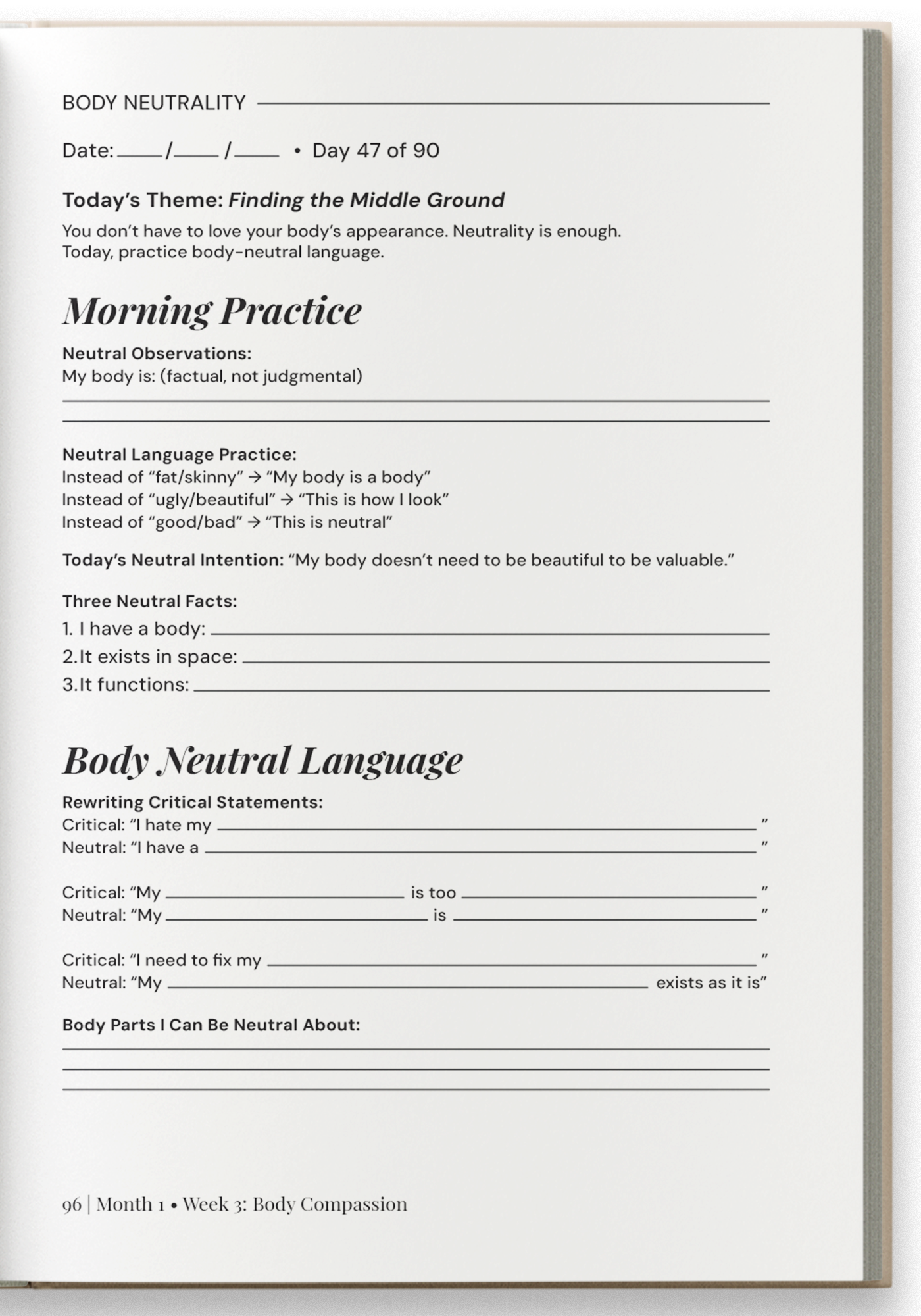 Stop the exhausting body positivity pressure. Learn to speak neutrally about your body ("arms" not "fat arms"). Includes ready-to-use scripts when others comment on appearance.