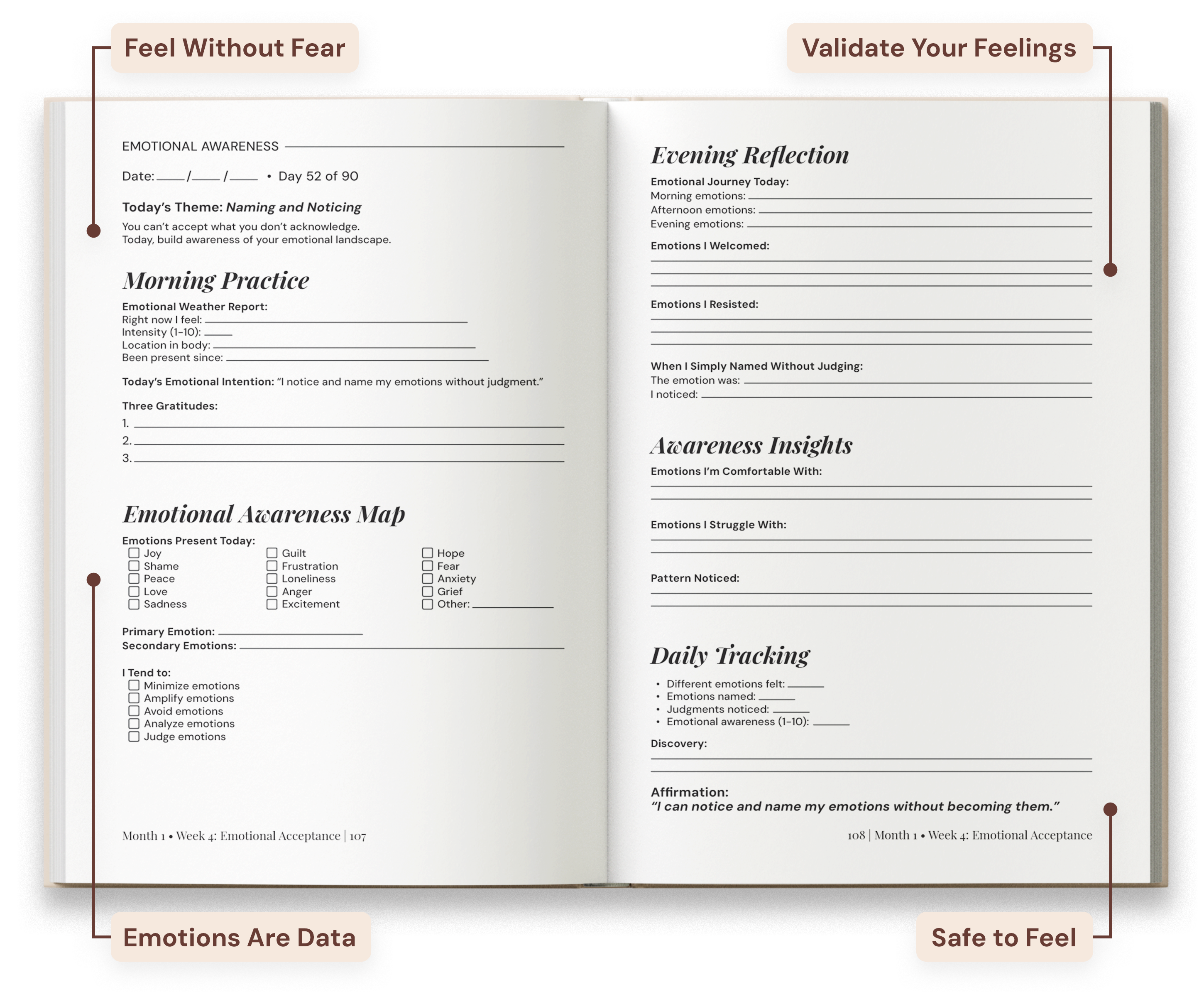 ✓ That paralyzing fear of starting (and failing at) another self-help thing — This journal assumes you'll miss days. Built-in comeback protocols mean you never "fail" — you just return, stronger.