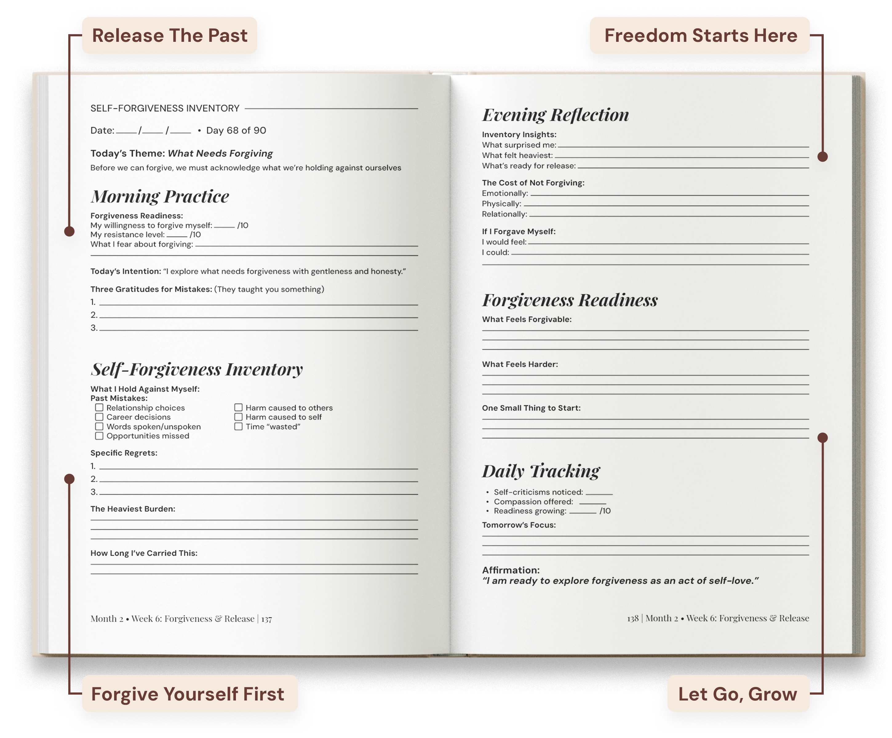 Most successful users establish a consistent time—morning with coffee or evening before bed. The journal is designed for 10-15 minutes daily, but includes 2-minute "bare minimum" options for tough days. Days 1-30 build your foundation (15-20 minutes), Days 31-90 are practice integration (10-15 minutes). Use the emergency protocols anytime you're spiraling, can't sleep, or need immediate self-compassion.