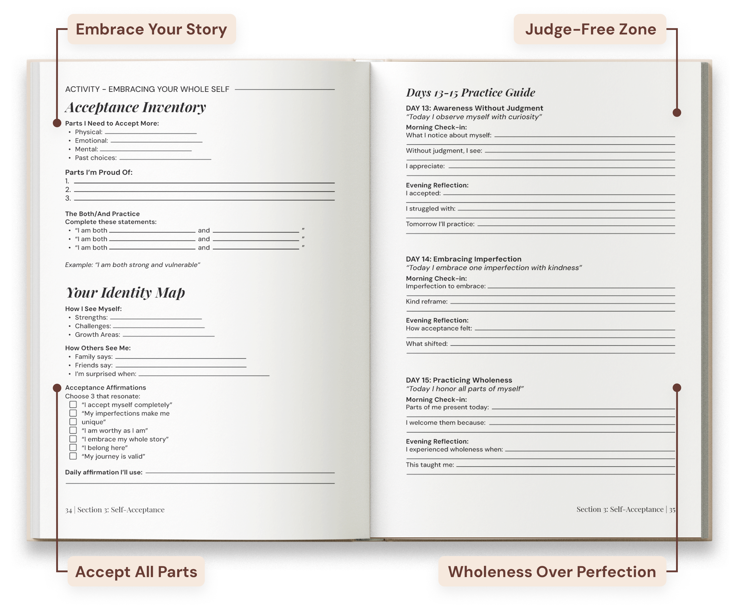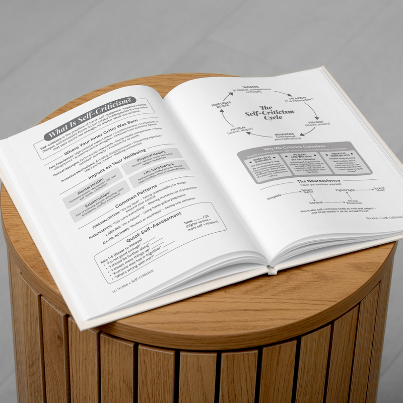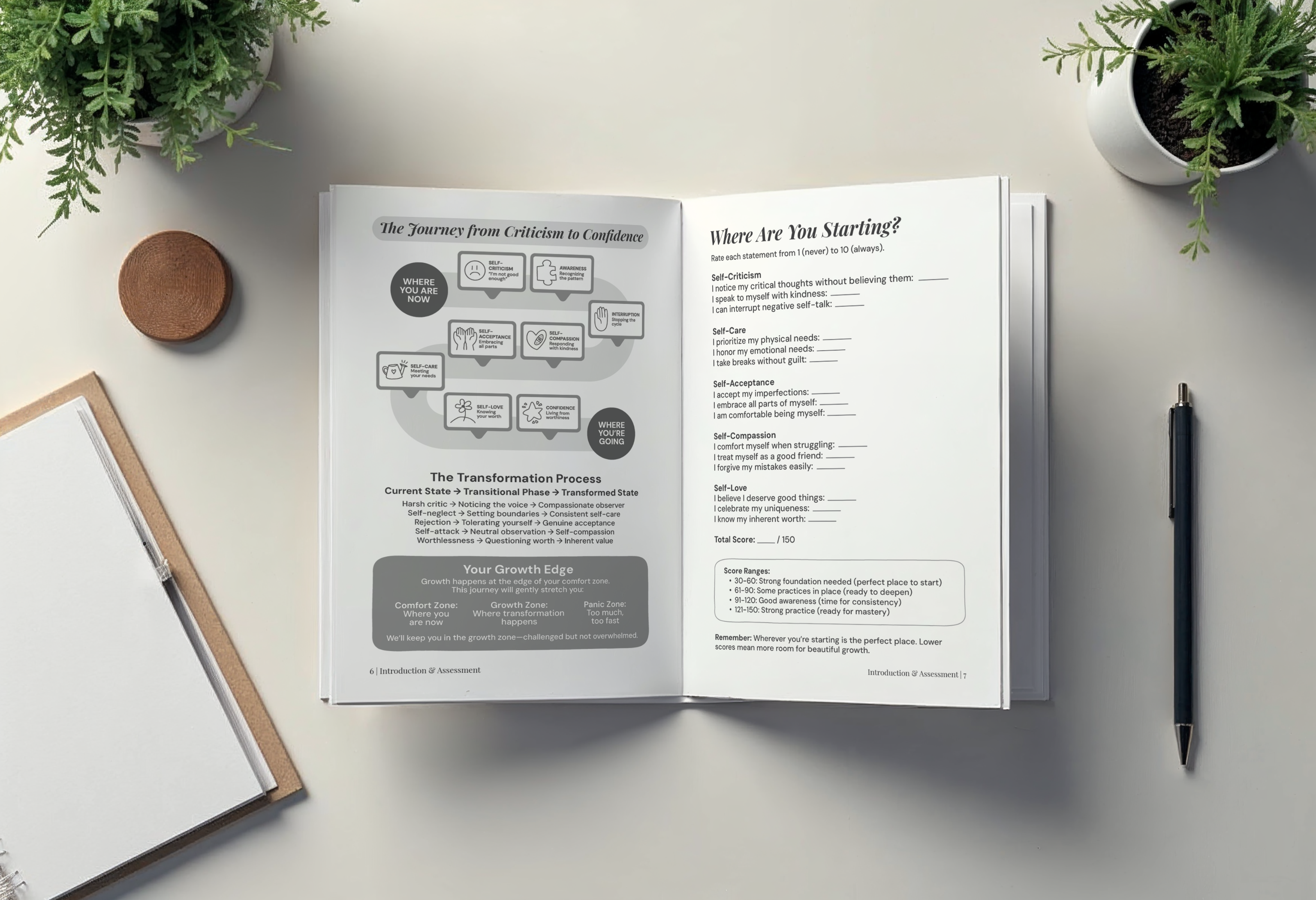 Perfect—neither do we, at least not the toxic positivity version. This journal doesn't ask you to lie to yourself with fake affirmations. Instead, you'll examine evidence, practice neutrality before attempting love, and build genuine self-compassion based on facts, not feelings. The goal isn't to love everything about yourself—it's to stop the self-hatred that's exhausting you and blocking your growth.