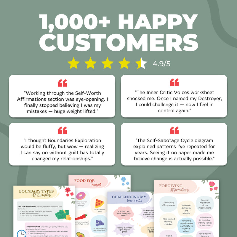 Inside the Ultimate Self-Esteem Workbook, you’ll discover a 90+ page guided journey across 7 life-changing sections: