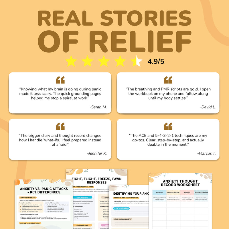 ✔ Regain control of your body — use guided breathwork and Progressive Muscle Relaxation scripts to slow your heart, ease dizziness, and release tension within minutes.
